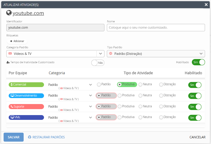 Ex.: A Equipe do setor Comercial utiliza o WhatsApp como ferramenta de trabalho e o tipo de atividade é Produtiva. Mas para o restante da empresa o WhatsApp estará com a classificação padrão, Distração.