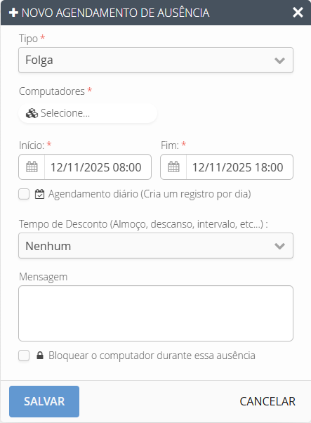 Ao marcar essa opção, o sistema cria automaticamente uma ausência por dia, entre as datas selecionadas, dentro do horário configurado.